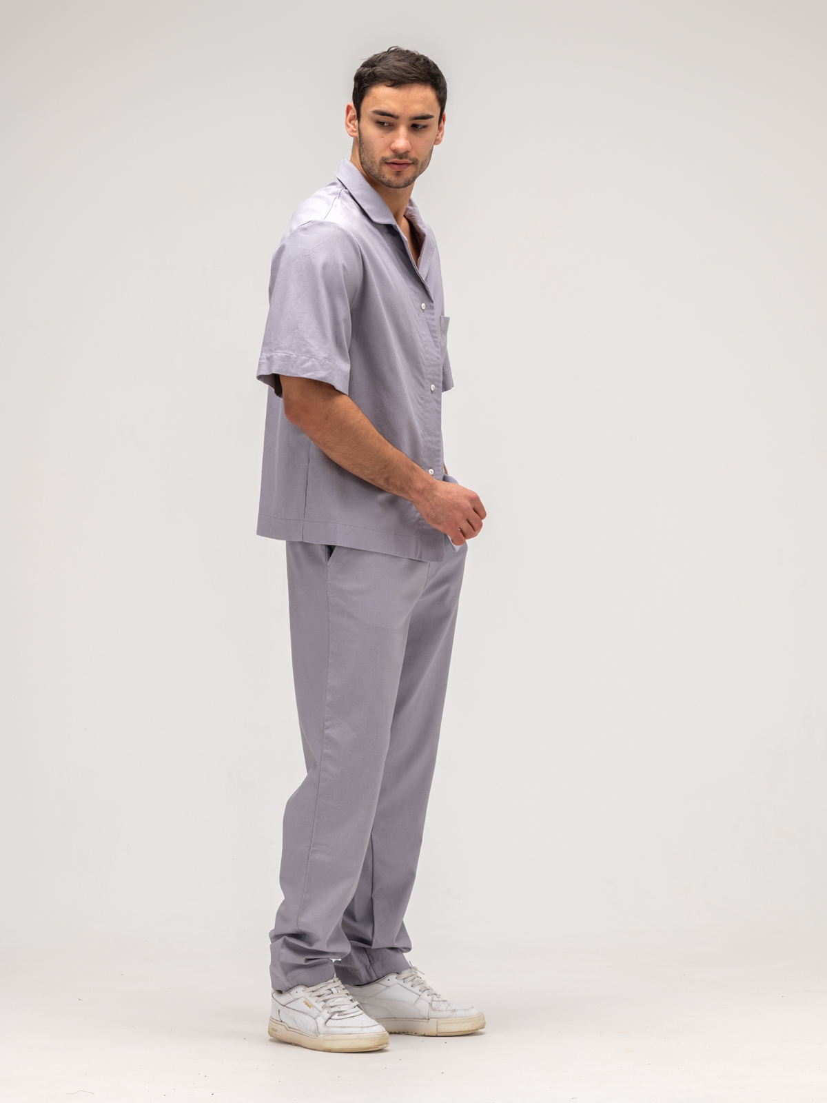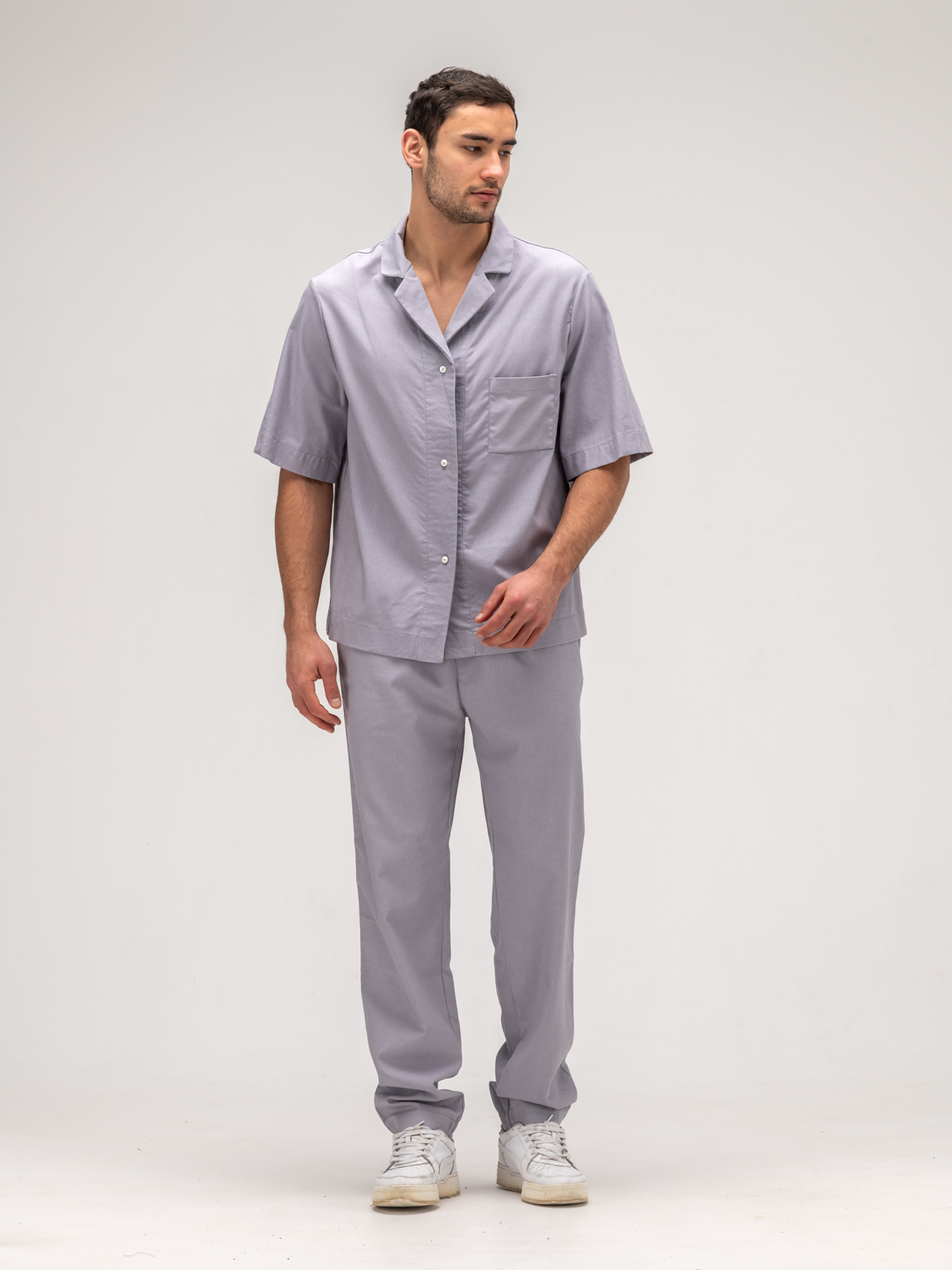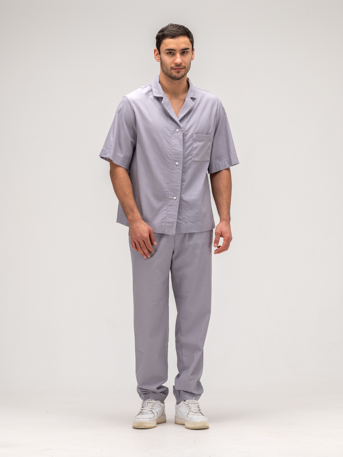 Рубашка с коротким рукавом идеально дополняет образ, обеспечивая свободу движений и легкость. Ее элегантный крой подчеркивает силуэт, а свежие оттенки и оригинальные принты добавляют индивидуальности. Джоггеры, выполненные из того же льняного материала, гармонично завершают комплект, сочетая стиль и комфорт.