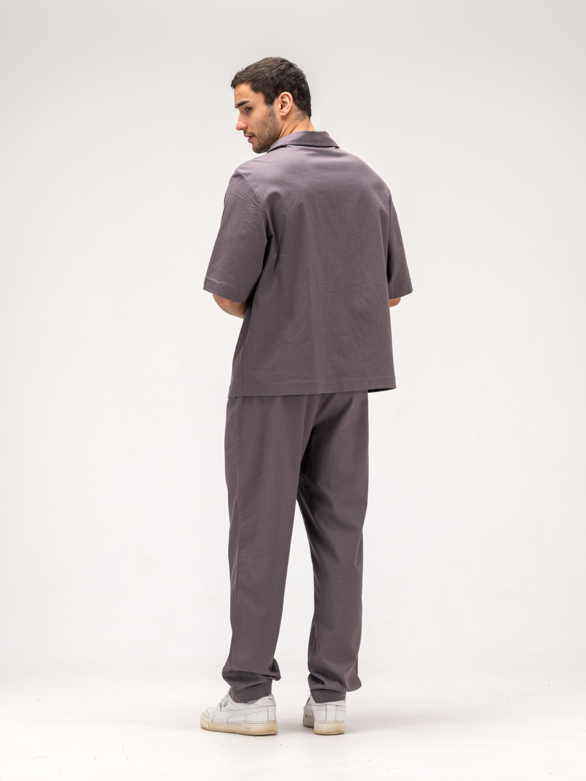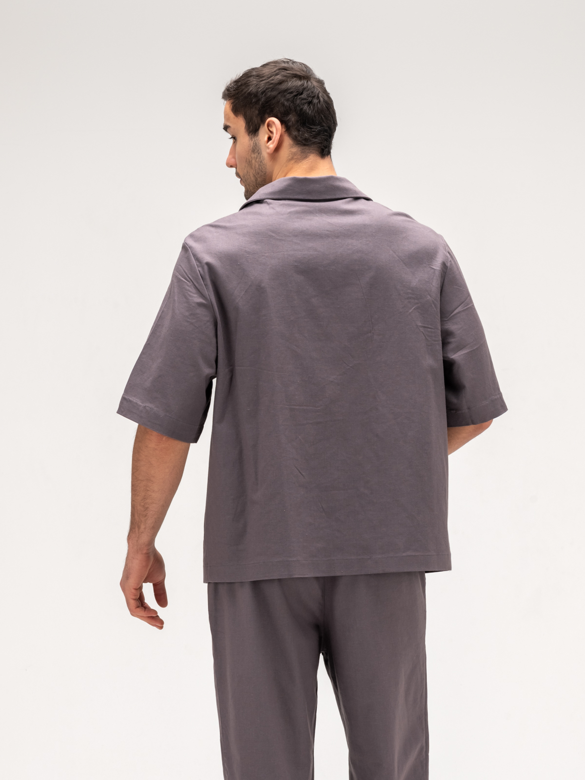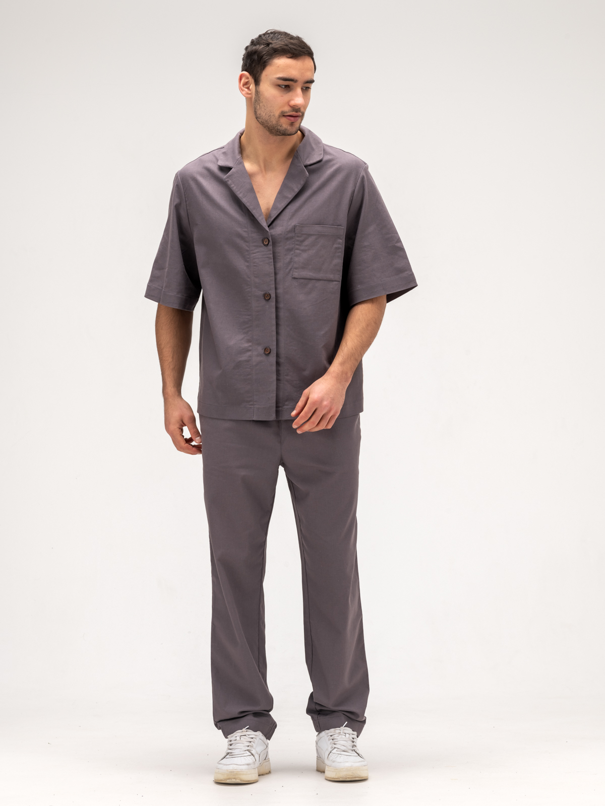Рубашка с коротким рукавом идеально дополняет образ, обеспечивая свободу движений и легкость. Ее элегантный крой подчеркивает силуэт, а свежие оттенки и оригинальные принты добавляют индивидуальности. Джоггеры, выполненные из того же льняного материала, гармонично завершают комплект, сочетая стиль и комфорт.