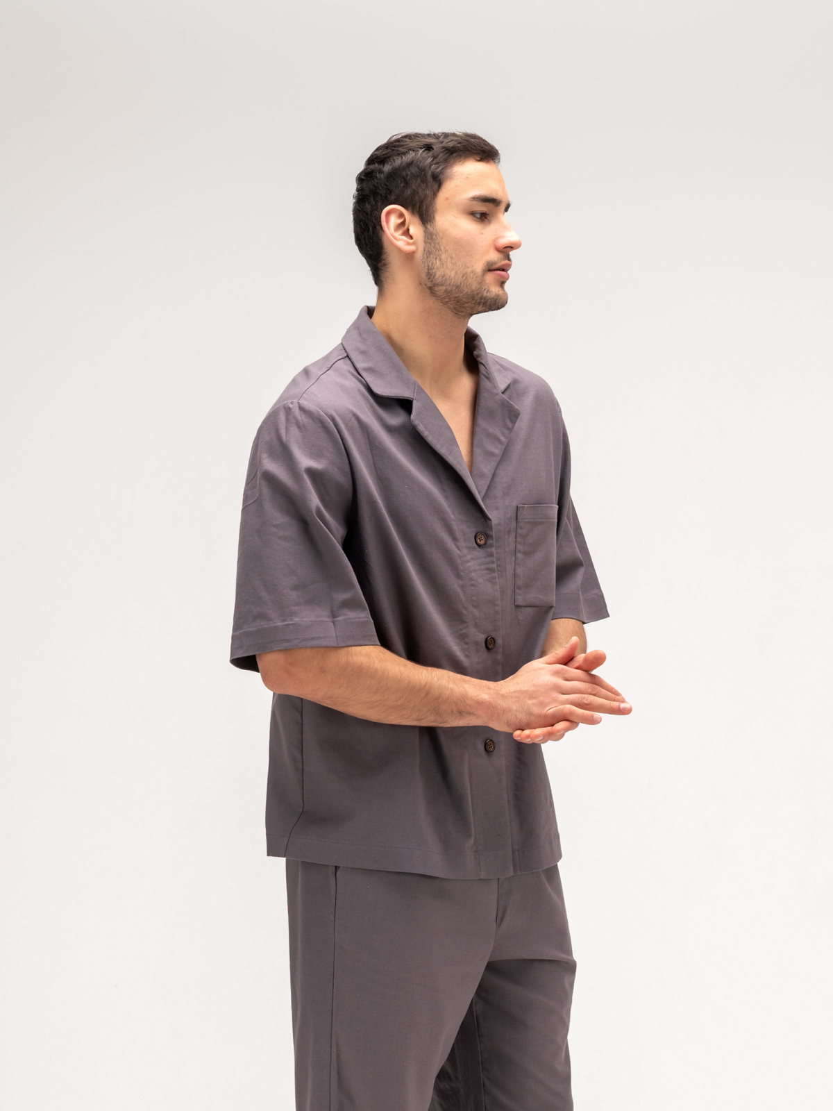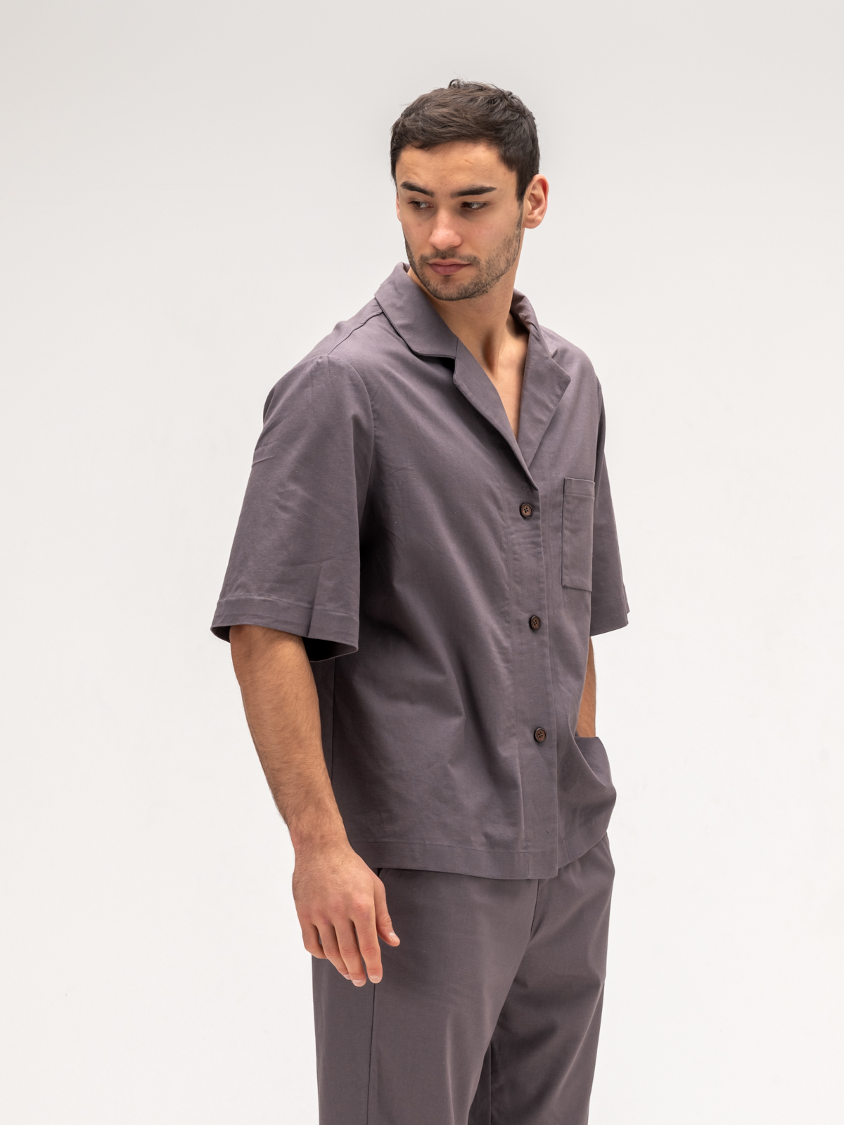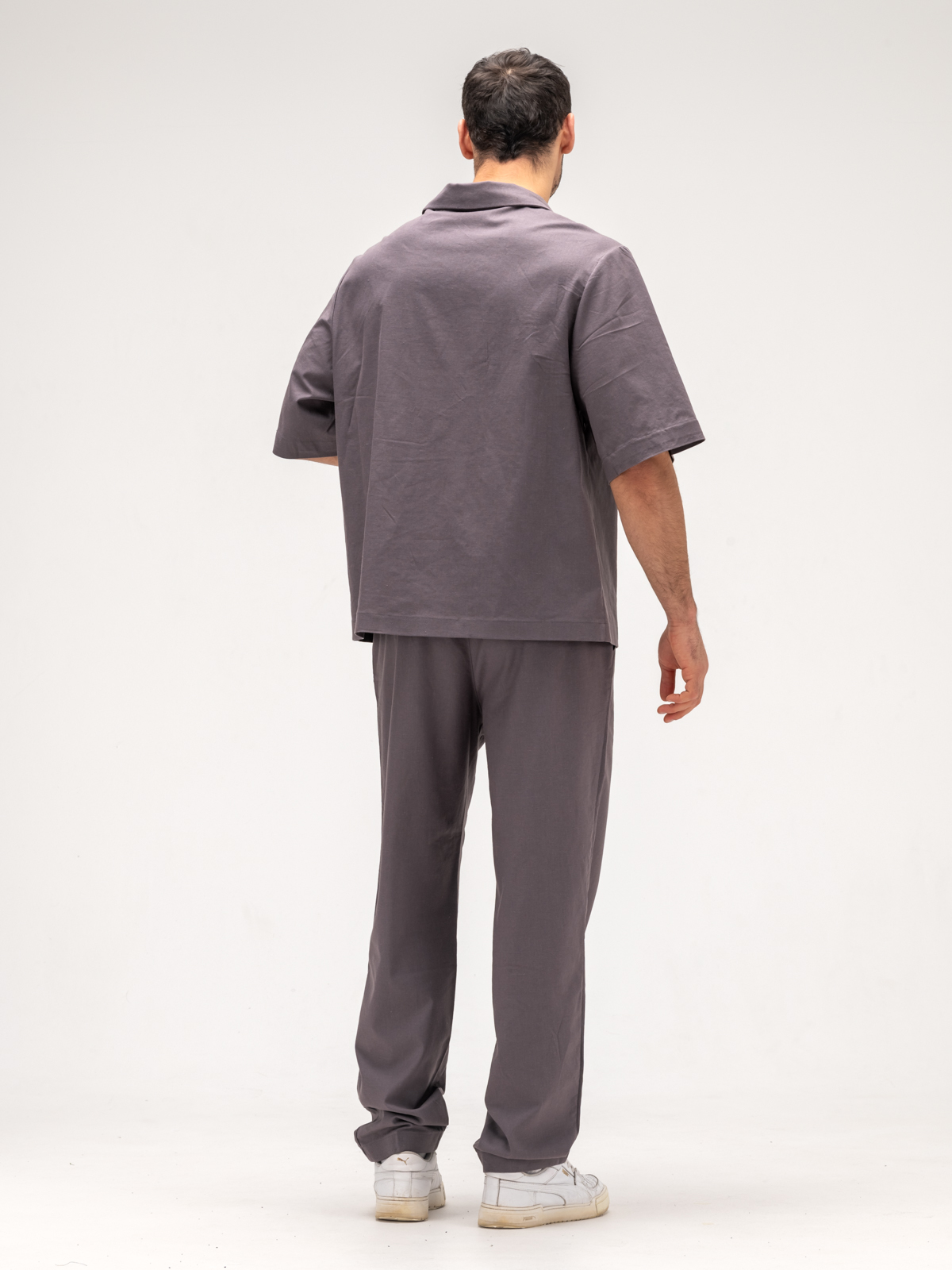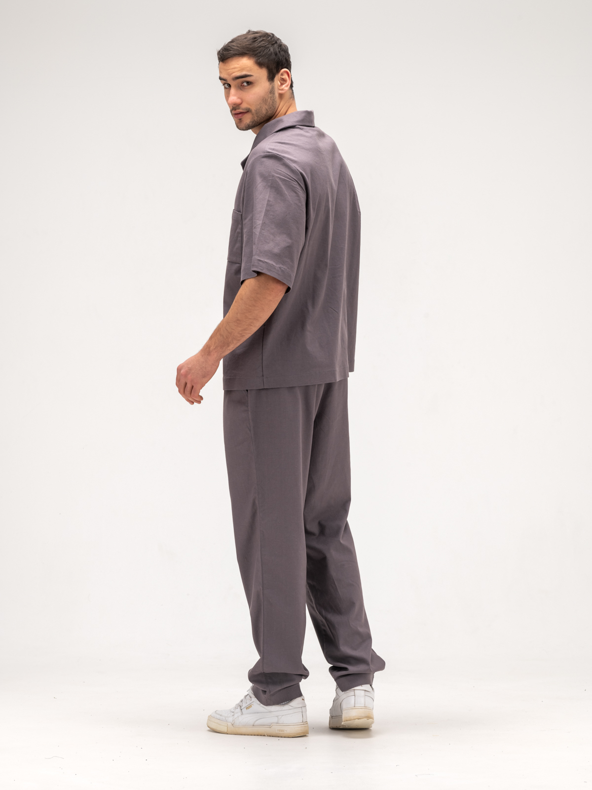 Рубашка с коротким рукавом идеально дополняет образ, обеспечивая свободу движений и легкость. Ее элегантный крой подчеркивает силуэт, а свежие оттенки и оригинальные принты добавляют индивидуальности. Джоггеры, выполненные из того же льняного материала, гармонично завершают комплект, сочетая стиль и комфорт.